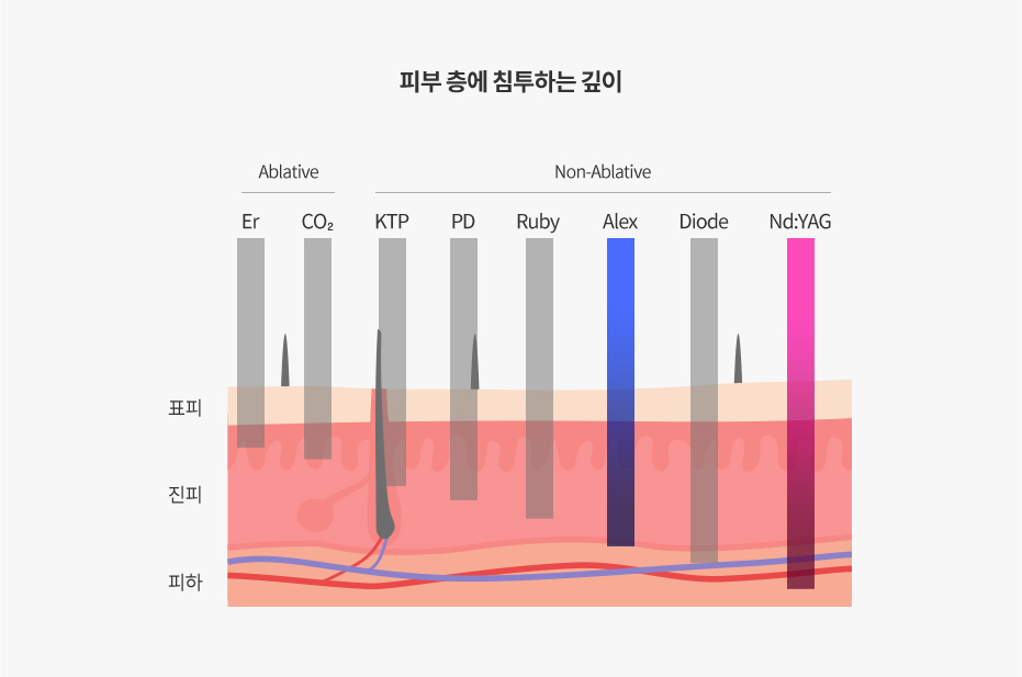색소 질환과 제모에 효과적이며, 주변 피부의 손상이 거의 없어 안전합니다.